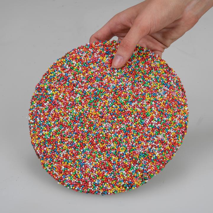 Milk chocolate (sugar, milk solids, cocoa butter, cocoa mass, emulsifiers (soya lecithin, 476), flavours, milk chocolate, contains cocoa solids 27%, milk solids 24%), Sugar, Corn starch, glazing agent 903, Colours 102, 110, 122, 123, 124, 133