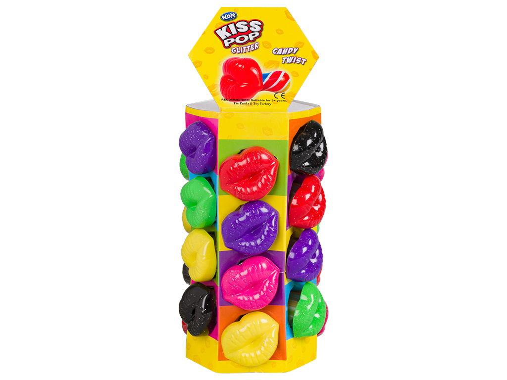 Hard candy attached to a plastic support shaped like kissing lips. Multicolor stripes hard candy cherry+strawberry flavored. 6 different colors with silver glitter: red, violet, yellow, pink, green and black.