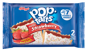 These Pop-Tarts are toaster pastries that contain a sugary frosted strawberry flavoured filling sealed inside two layers of thin, rectangular pastry crust.